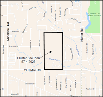 The Farmington Hills Planning Commission shall formally consider an application for a One-Family Cluster Site Plan (57-4-2025). The applicant, Eureka Development Group, is seeking a recommendation from the Planning Commission to City Council for approval of a One-Family Cluster Site Plan to develop fifty-two (52) attached units across thirteen (13) buildings with four (4) ranch units in each building in a residential site condominium within the RA-1, One Family Residential District.