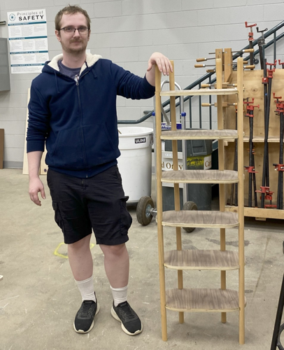 Nick Popkes, a Makerspace technician, created a sturdy shelf to display his candle collection using cutoffs from a project someone else made using the Shopbot. With nothing but a couple wooden dowels from a clearance rack and some glue he found in his garage, Nick was able to construct a classy new shelf! “I cut some slots into the dowels, then slid the round pieces in with some glue to secure them. The point of it was to be really simple, so I’m happy with the way it turned out. The fact that it was so easy to put together was a bonus,” said Popkes.