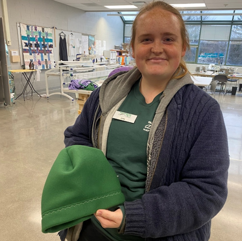Last year, The Crafted in Kindness challenge inspired our very own Makerspace technician, Nick P., to learn something new. After prepping countless fleece cutouts for participants, he learned to sew to help make as many hat and mitten sets as he could. He says, “I really enjoyed the sense of community and camaraderie when everyone was sewing together. I look forward to beating my sewing record of hats and mittens from last year, and helping other people set records of their own this year.”