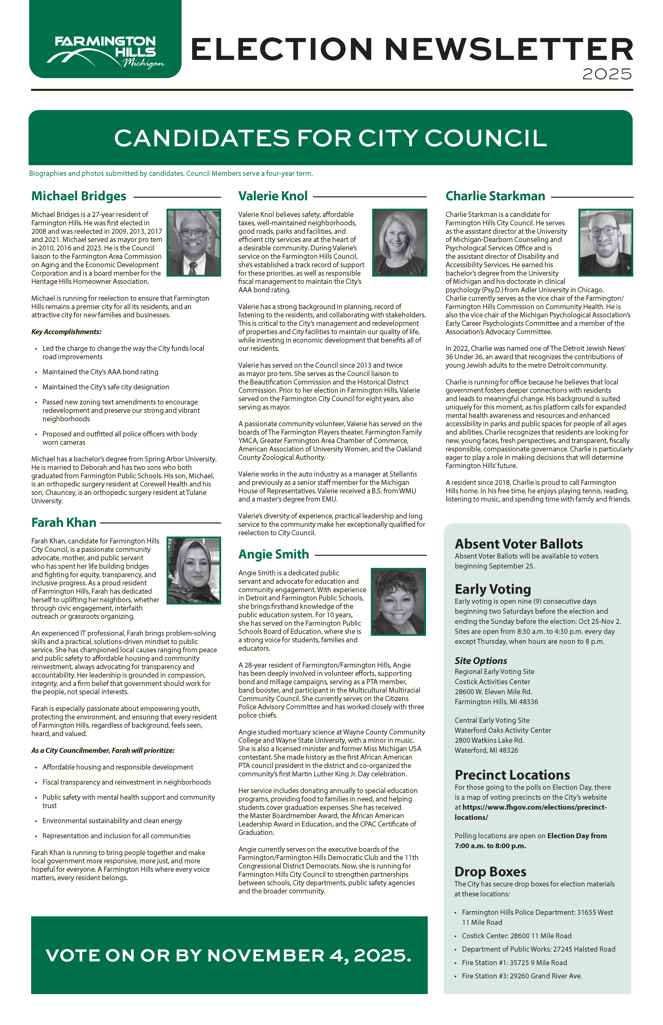 This newsletter provides an overview of information for the Nov. 4 election, including proposals and information about absent voter ballots, early voting, and voter precinct locations.