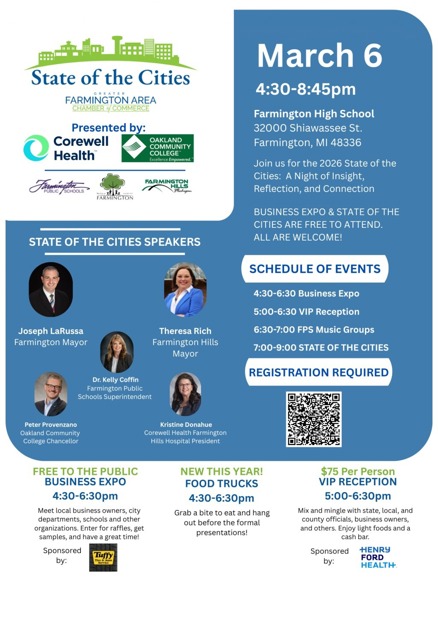 The Greater Farmington Area Chamber of Commerce will host its State of the Cities event at 7 p.m. on Friday, March 6 at Farmington High School. Community members will have a chance to hear from Farmington Hills Mayor Theresa Rich about recent progress and upcoming initiatives in the City, as well as updates from other community leaders in the region. Tickets for the State of the Cities program are free but must be reserved in advance.