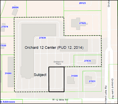 The subject property is located on the north side of 12 Mile, west of Orchard Lake Road, and being more particularly described as: Parcel Identification Numbers: 22-23-10-476-067, City of Farmington Hills, Oakland County, Michigan.